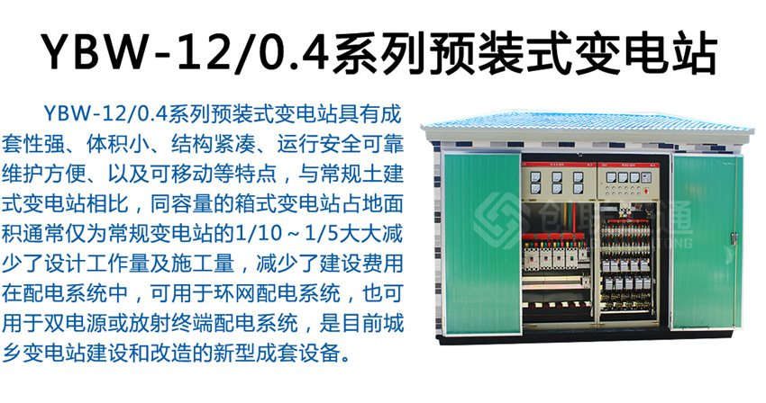 YBW-12系列預裝式箱式變電站YBW-12系列預裝式變電站,是將高壓電器設備、變壓器、低壓電器設備等組合成緊湊型成套配電裝置,箱體材料采用槽鋼、鋁合金與阻燃型復合材料制作而成。